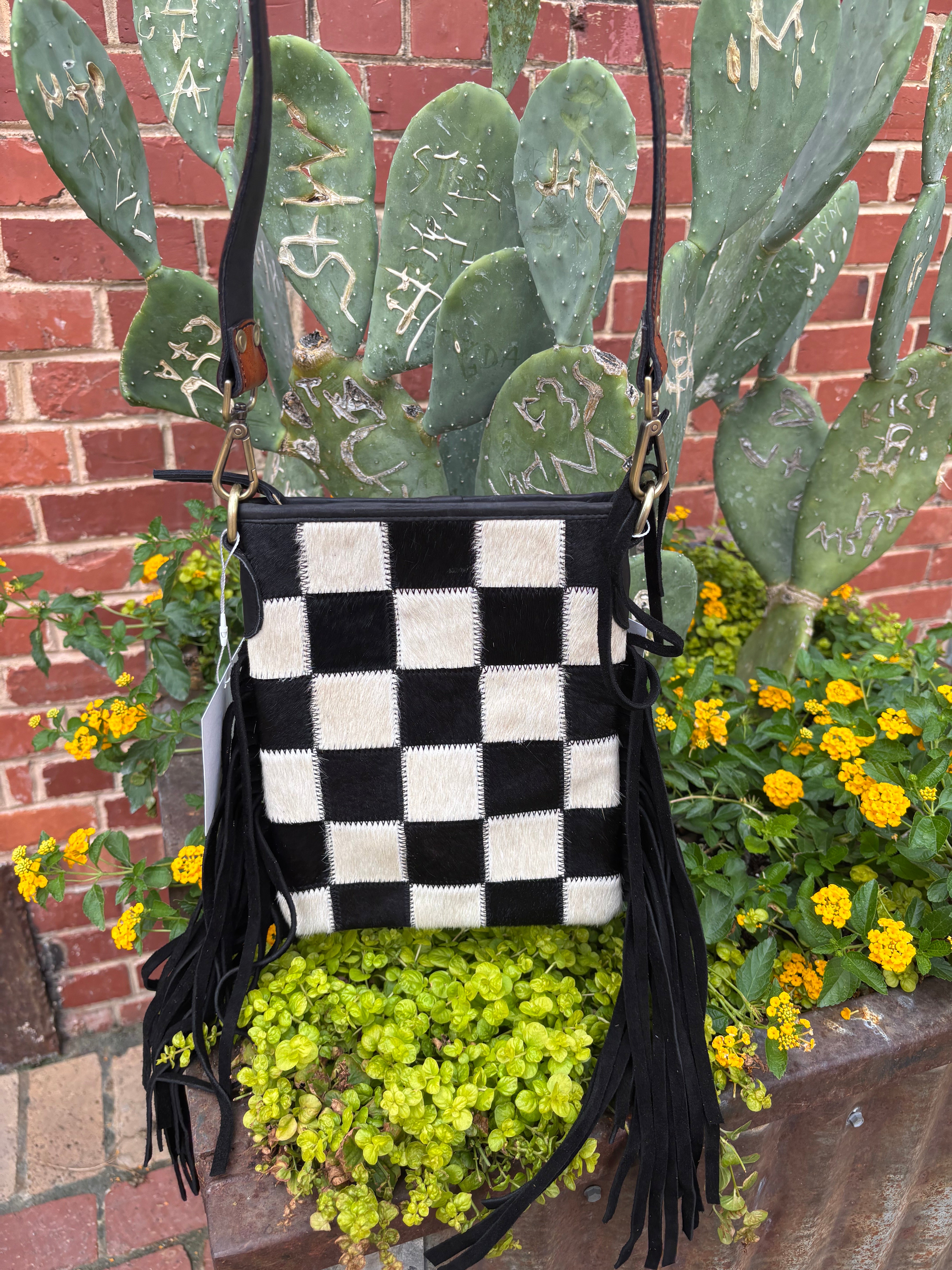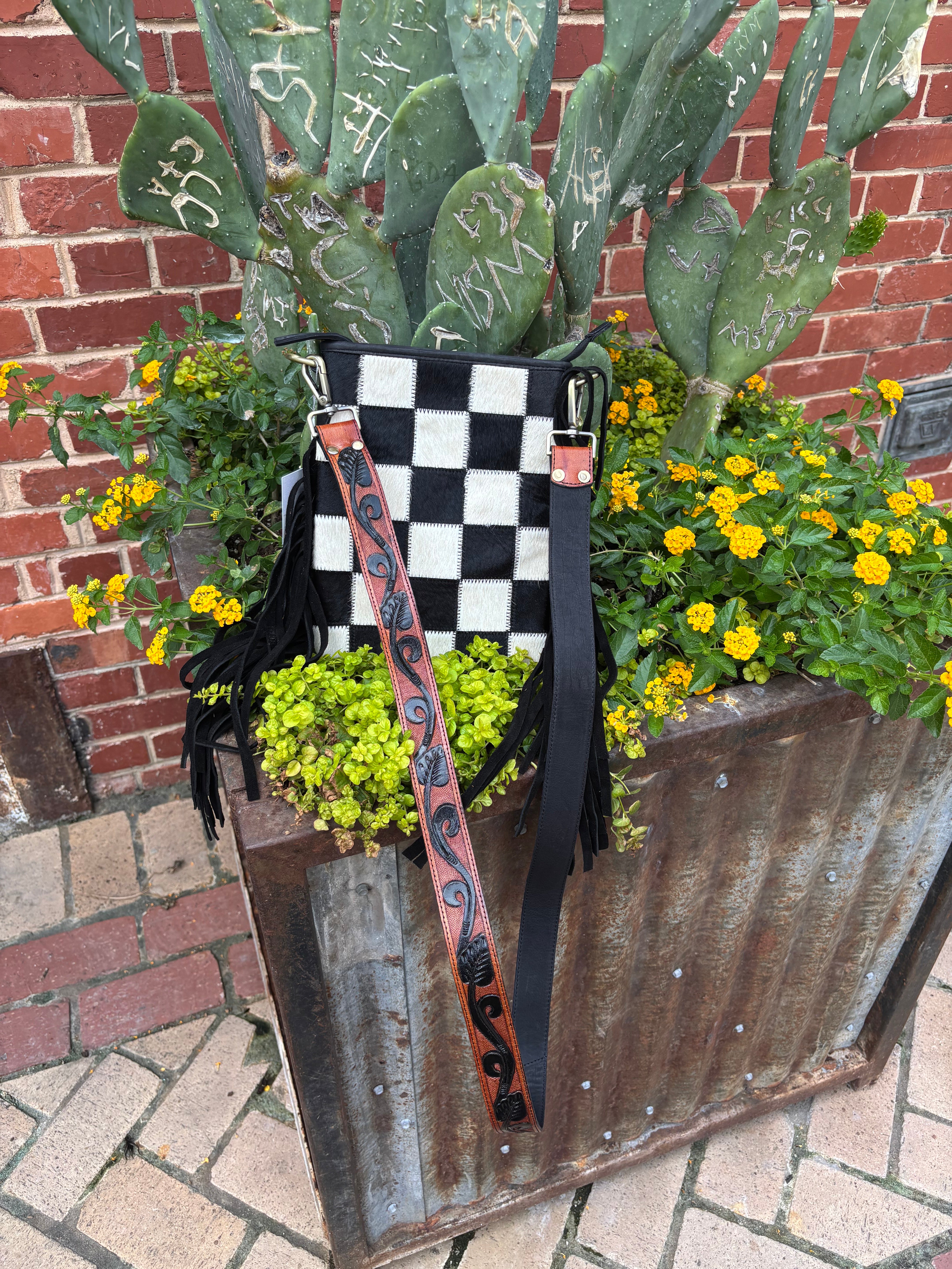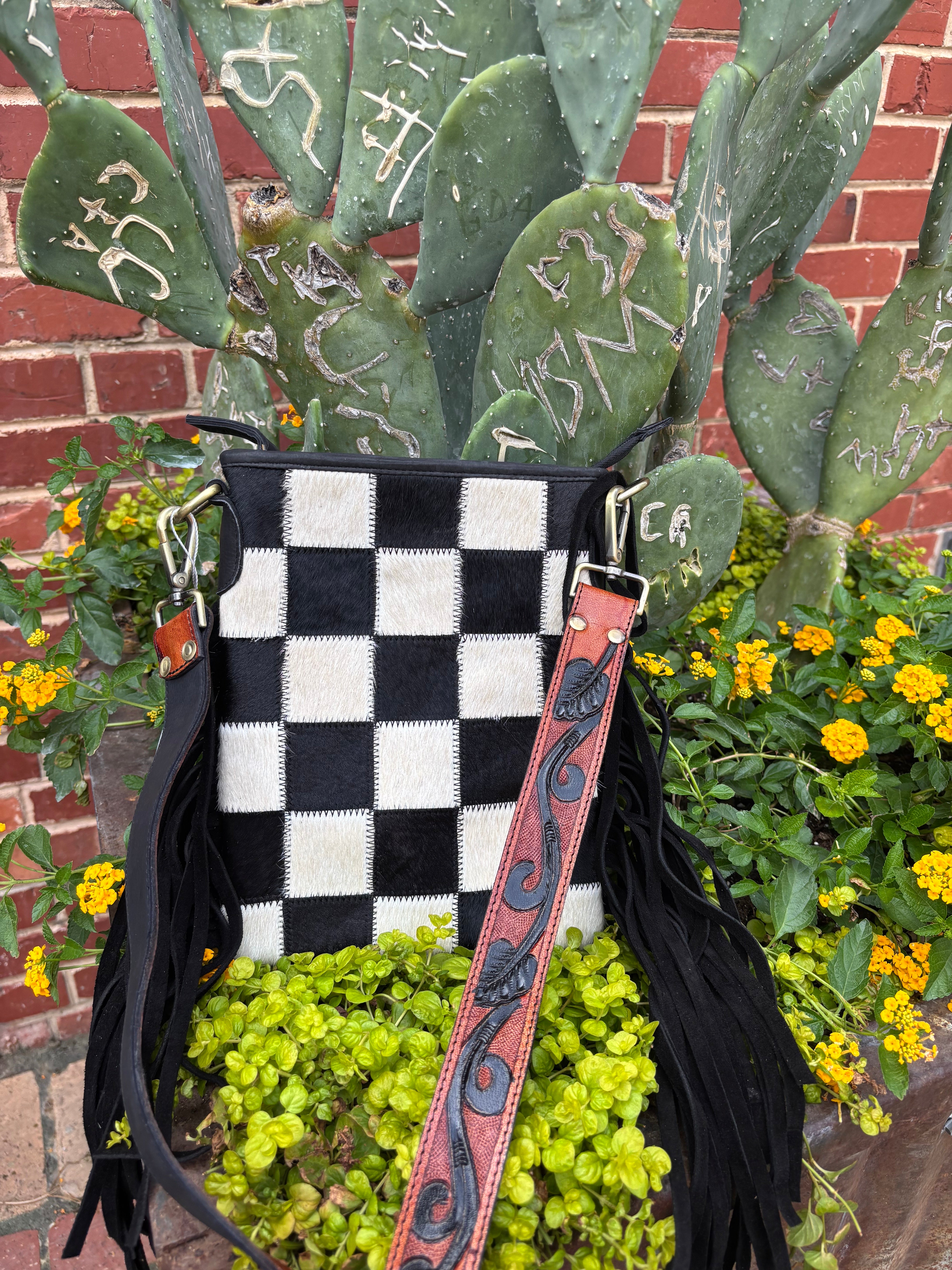 The Stockyard purse features a luxurious cowhide checkered front and a leather back for a unique and stylish look. The addition of suede fringe and a tooled leather strap add texture and depth, making it the perfect accessory for any outfit. It measures 10 inches by 8 inches and strap measures 50 inches. The back features a zipper pocket and inside also has a zippered side pocket