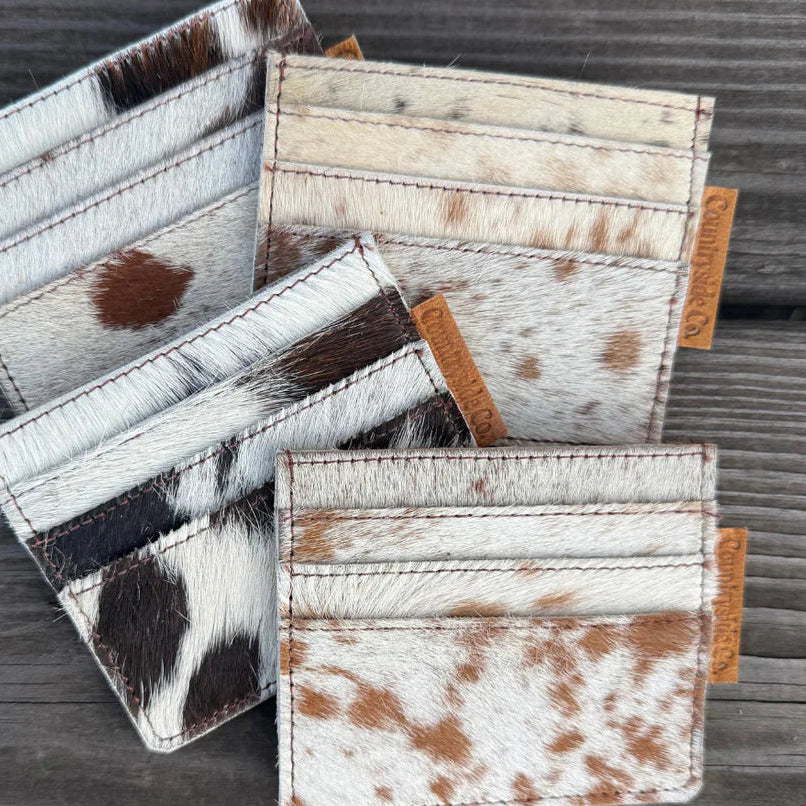 Get ready to mooooove through your day with our Cowhide Credit Card Holder! With a slim design that holds alot, it features credit card slots on both the front and back, plus a center pocket. The cowhide front and back provides durability. Get yours today!