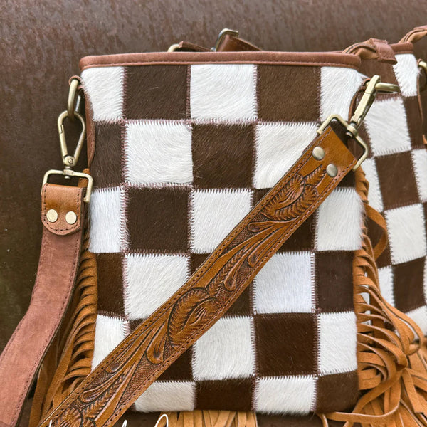 The Dixie purse features a luxurious espresso color cowhide checkered front and a leather back for a unique and stylish look. The addition of suede fringe and a tooled leather strap add texture and depth, making it the perfect accessory...