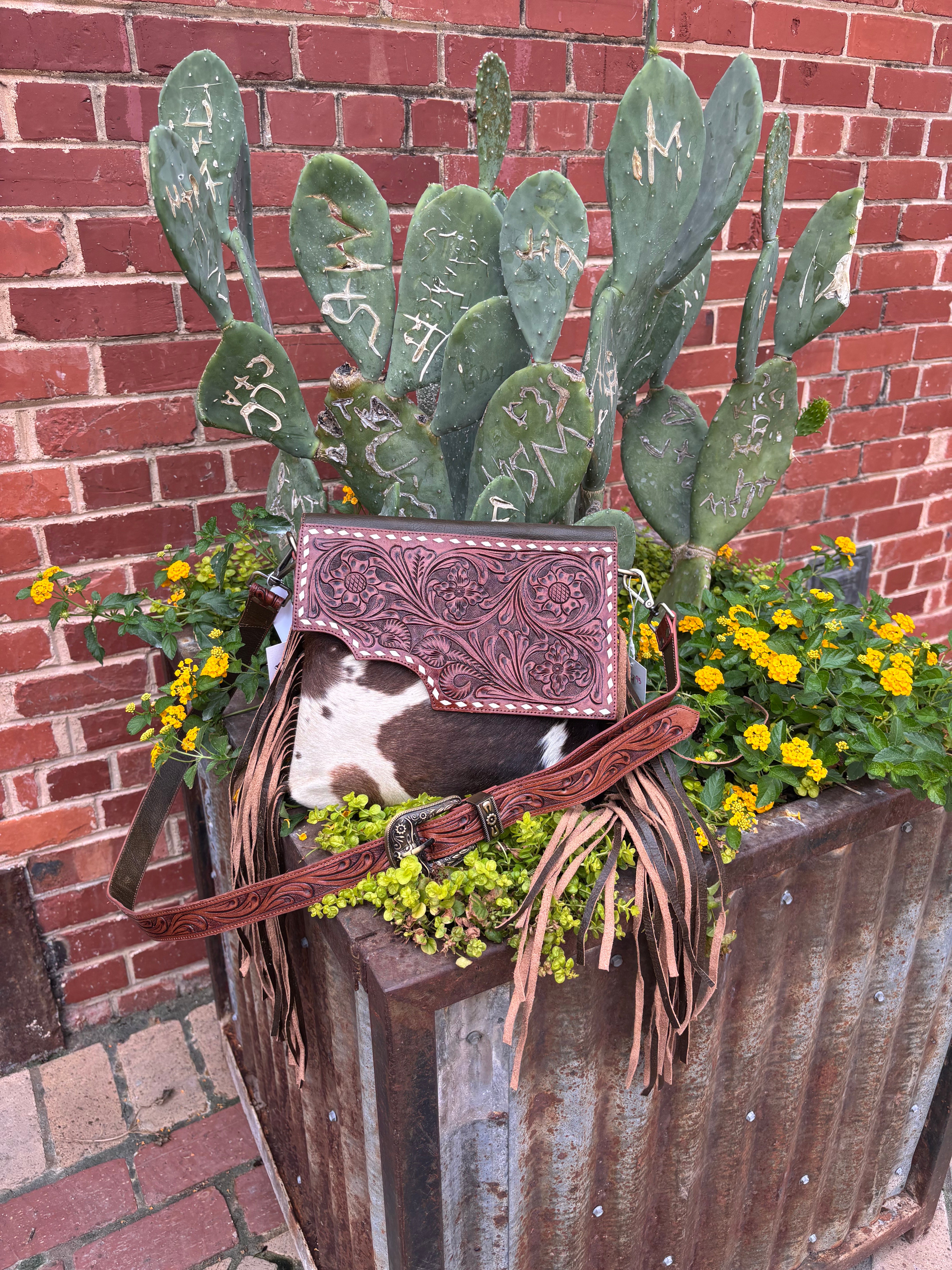 Georgia Conceal Carry Tooled Leather Purse features a cowhide front and leather back, along with two conceal carry pockets, finished off with side fringes. The tooled leather flap boasts intricate stitching and the detachable strap is adorned with a longhorn buckle that adds a unique touch to each bag. The interior offers additional storage with a side pocket and zipper side pocket. Measuring 11 inches in height and 10 inches in width, Georgia is individually crafted with one-of-a-kind cowhides so no two alike.
