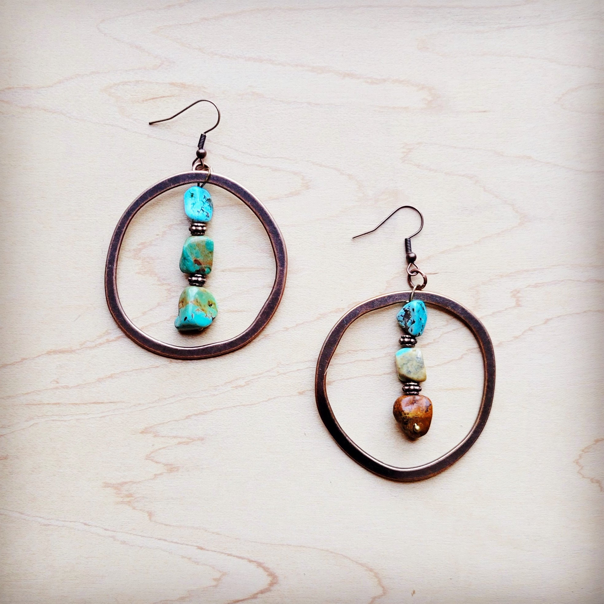 Expertly handcrafted with genuine Hubei Turquoise stones, these boho-inspired Copper Hoop Earrings add a touch of natural beauty to any outfit. The combination of turquoise and copper creates a unique and earthy look. Perfect for those looking to add a touch of artisanal elegance to their style.