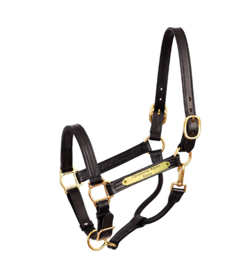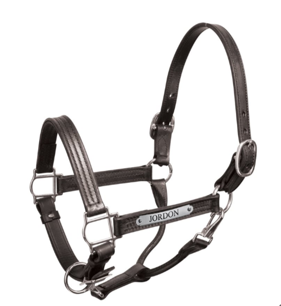 Perri's Premium 1" Leather Show Halter with Plate Amish made 1" leather halter. Triple stitched leather with double buckle crown. Rolled throat latch with snap and adjustable chin. Customize your 3/4" x 4" plate with up to 25 characters. Please...
