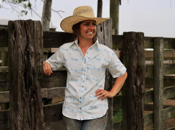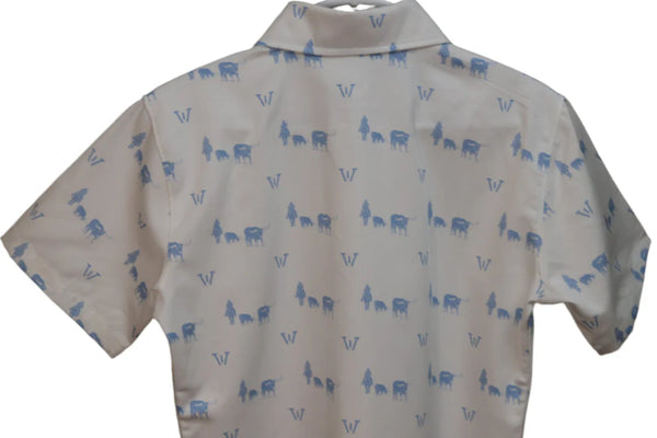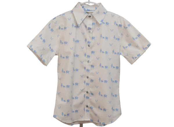 Cowboy Ware Pointing Them East - 100% Cotton Short-Sleeve Button-Down Model is wearing an Extra Small for reference. Before the great cattle drives headed north to Kansas railheads, some trail bosses pointed their herds east first—chasing better markets to New...